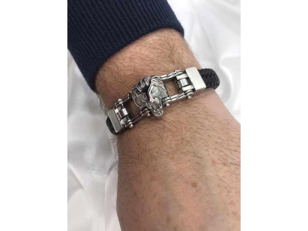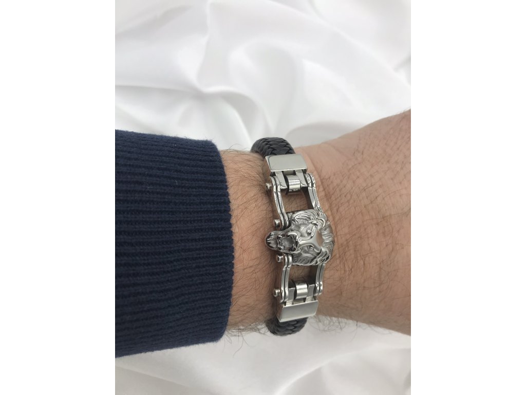 Krásný náramek z chirurgické oceli a kůže - lev - viz foto