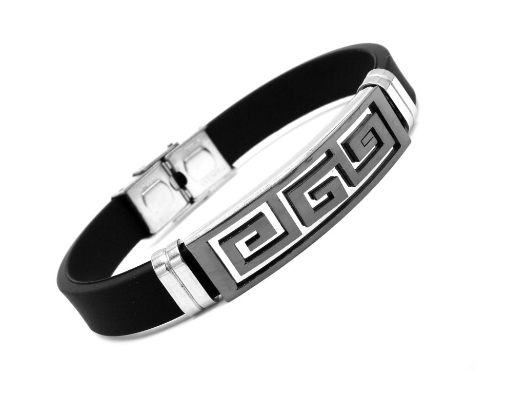 Materiál - chirurgická ocel + kaučuk. Materiál - chirurgická ocel - hypoalergenní (mohou ho nosit i lidé s alergií na bižuterii nebo stříbro). Náramek je vytvořen z materiálu, který je známý pro svou odolnost. Náramek z chirurgické oceli je hypoalergenní, tzn., že nevyvolává žádné alergické reakce. Náramek – chirurgická ocel je barevně stálá a nemění svoji barvu a je vysoce odolná vůči otěru a poškrábání. Šperk je vhodný na denní nošení. Náramek bez vsazených kamínků a jiných atributů náročnějších na péči a údržbu, je klasikou vhodnou pro každodenní nošení včetně kontaktu s vodou.