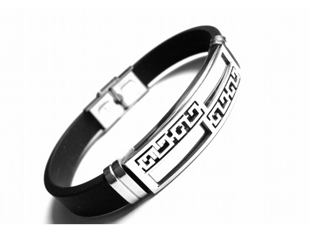Materiál - chirurgická ocel + kaučuk. Materiál - chirurgická ocel - hypoalergenní (mohou ho nosit i lidé s alergií na bižuterii nebo stříbro). Náramek je vytvořen z materiálu, který je známý pro svou odolnost. Náramek z chirurgické oceli je hypoalergenní, tzn., že nevyvolává žádné alergické reakce. Náramek – chirurgická ocel je barevně stálá a nemění svoji barvu a je vysoce odolná vůči otěru a poškrábání. Šperk je vhodný na denní nošení. Náramek bez vsazených kamínků a jiných atributů náročnějších na péči a údržbu, je klasikou vhodnou pro každodenní nošení včetně kontaktu s vodou.