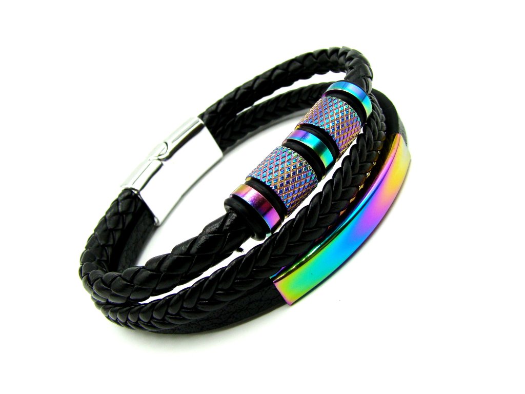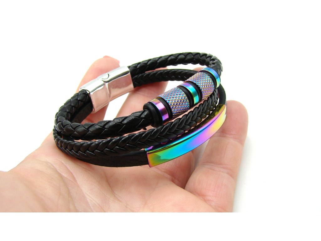 Pánský kožený náramek Černý a holografický dárkové balení zdarma