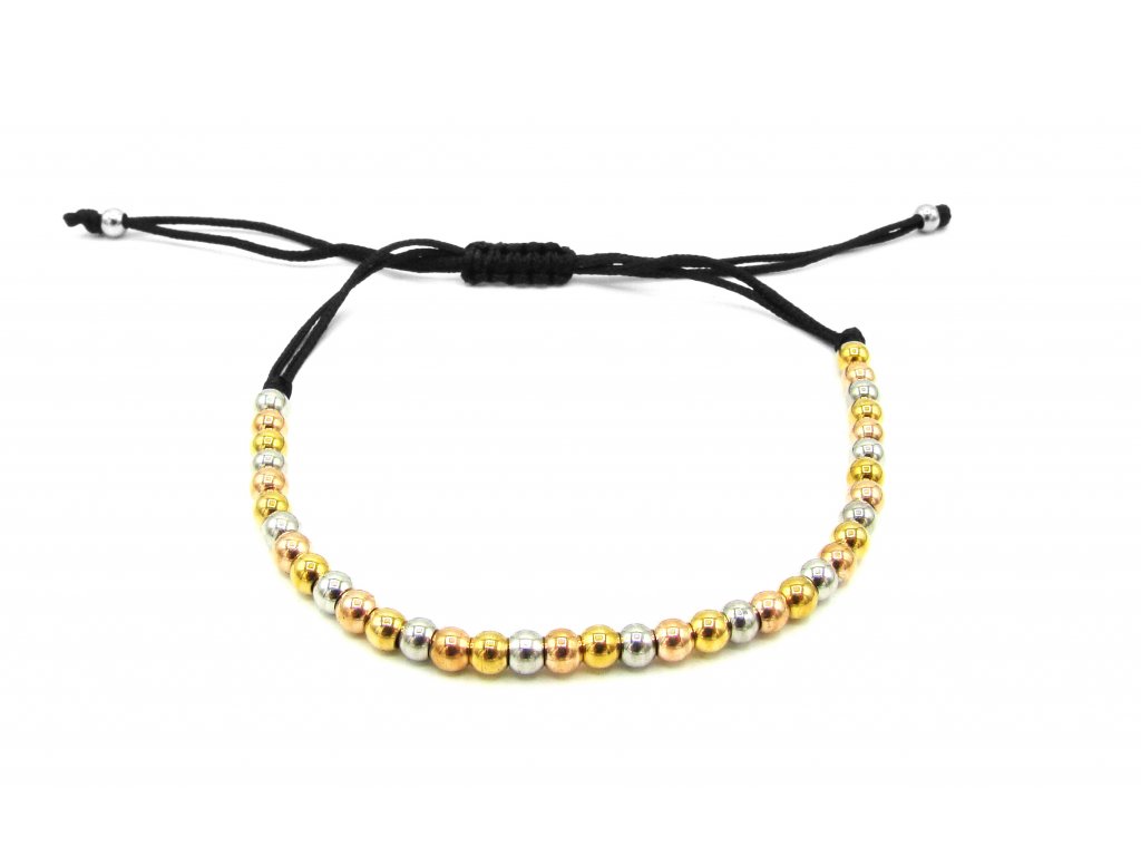 Materiál - chirurgická ocel. Materiál - chirurgická ocel - hypoalergenní (mohou ho nosit i lidé s alergií na bižuterii nebo stříbro). Náramek je vytvořen z materiálu, který je známý pro svou odolnost. Náramek z chirurgické oceli je hypoalergenní, tzn., že nevyvolává žádné alergické reakce. Náramek – chirurgická ocel je barevně stálá a nemění svoji barvu a je vysoce odolná vůči otěru a poškrábání. Šperk je vhodný na denní nošení. Náramek bez vsazených kamínků a jiných atributů náročnějších na péči a údržbu, je klasikou vhodnou pro každodenní nošení včetně kontaktu s vodou. Šňůrkové náramky jsou módním hitem. a dají se krásně kombinovat s jinými náramky. Můžete s nimi do vody a nemusíte je před koupáním sundávat. Délku vašeho náramku si zvolíte podle obvodu vašeho zápěstí. Kuličky jsou z chirurgické oceli. Barva - zlatá a stříbrná.