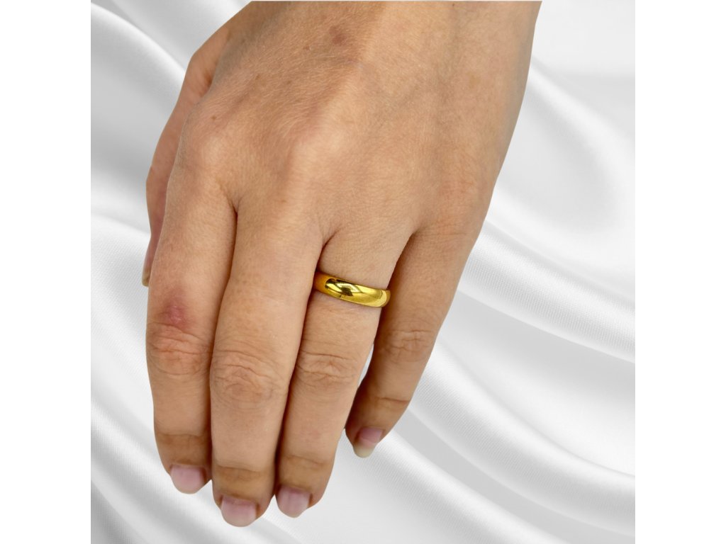 Tento hladký zlatý prsten z chirurgické oceli je univerzálním doplňkem, který se hodí jak k elegantnímu outfitu, tak k volnočasovému stylu.