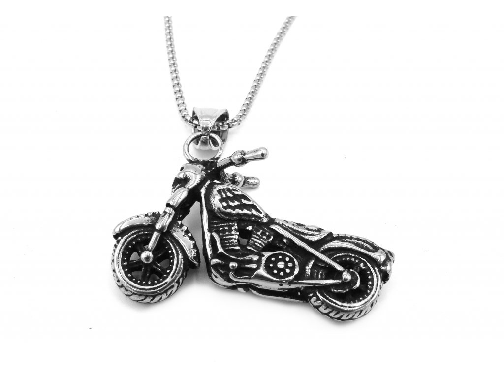 Krásný řetízek a přívěsek z chirurgické oceli - motorka s lebkou - viz foto. Barva - stříbrná a černá.
