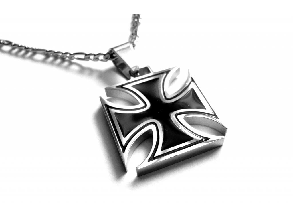 Krásný řetízek v délce cca 55 cm a přívěsek maltézský kříž z chirurgické oceli oblíbený u motorkářů o průměru cca 27 mm. Viz foto.
